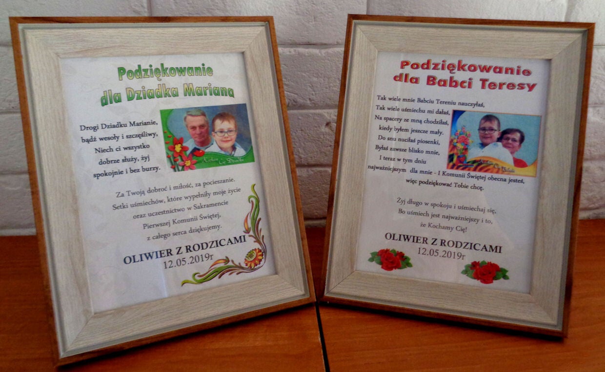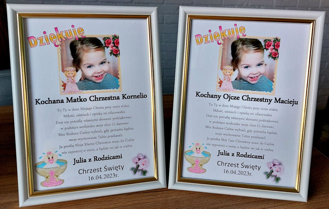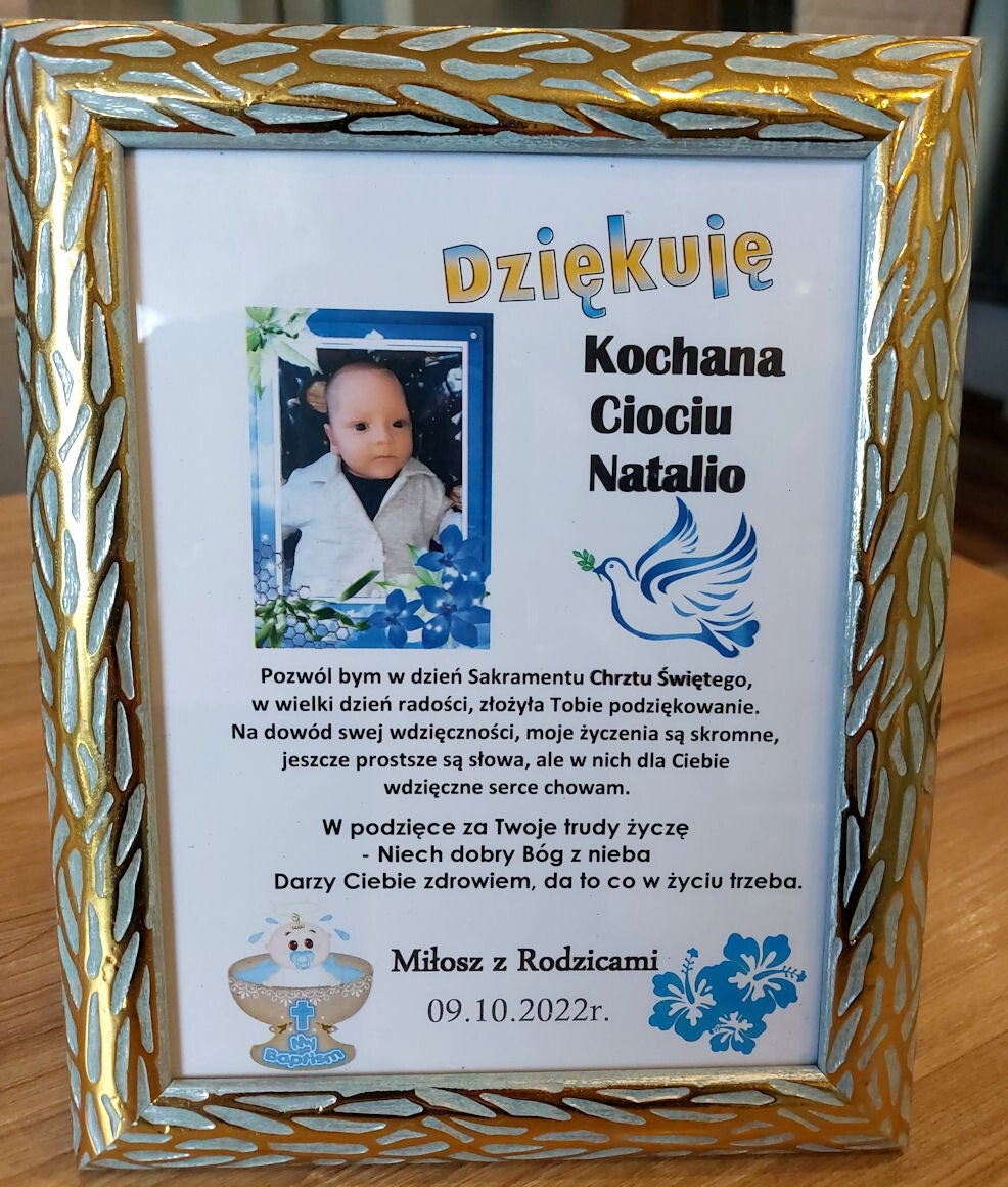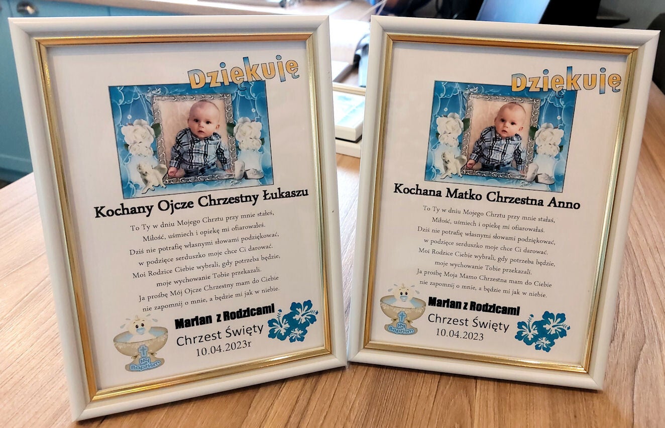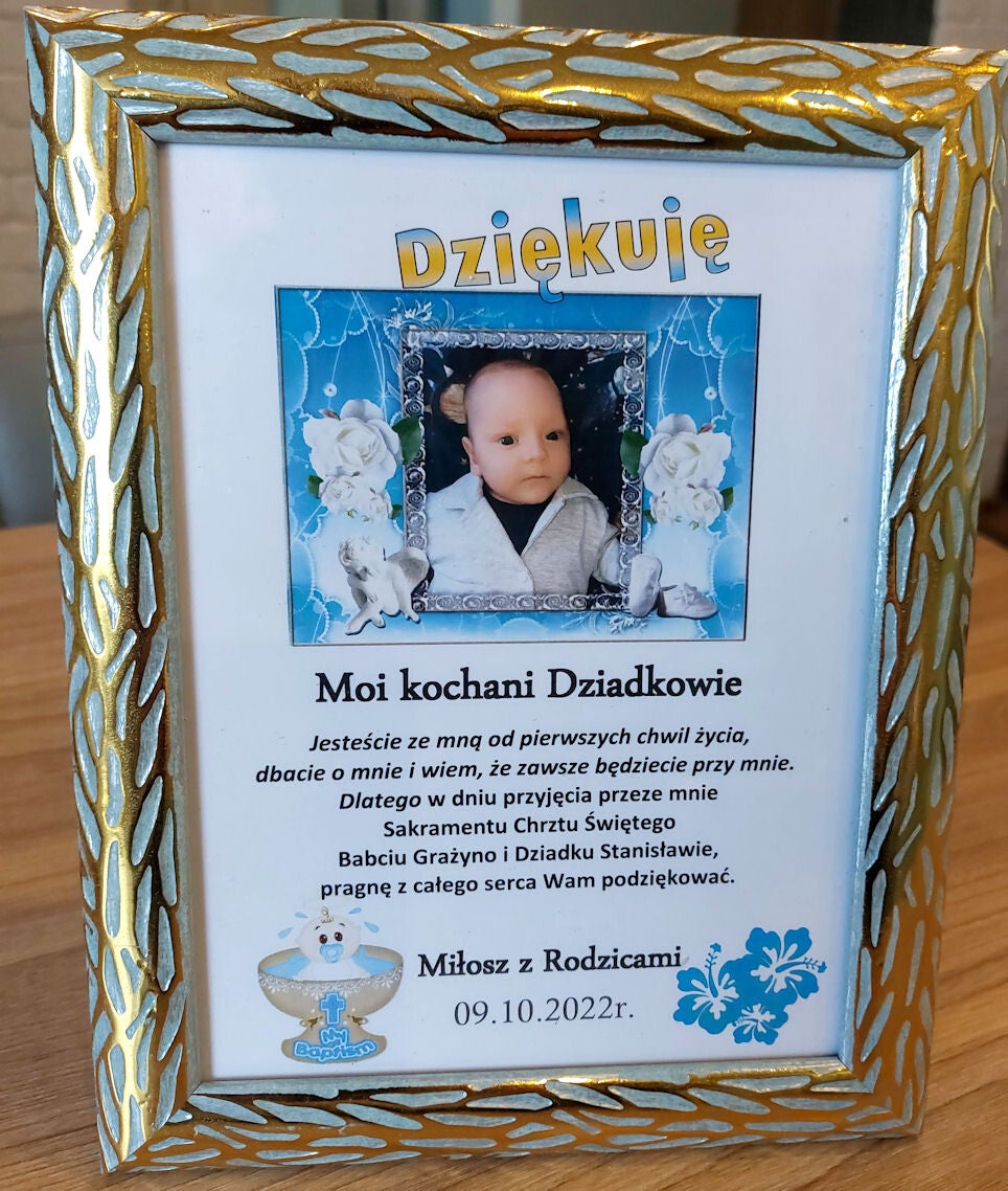 Podziękowanie w ramce na Chrzest Święty dla Rodziców Chrzestnych, Dziadków rozm.15x21